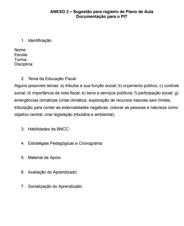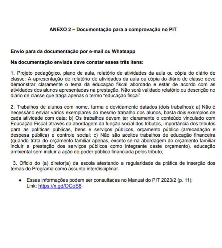 Na segunda etapa, as escolas irão desenvolver atividades envolvendo a temática, com habilidades propostas na BNCC, para cada etapa de ensino (Educação Infantil, Ensino Fundamental e Médio). Após os estudos, cada escola deverá enviar os documentos comprobatórios das atividades para o registro no Programa de Integração Tributária (PIT). Os documentos estão listados no Anexo 2.